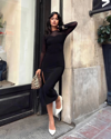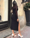 İntive lingerie-innocent&attractive Kadın Tül Detaylı Siyah Midi Boy Yandan Yırtmaçlı Uzun Kollu Sıfır Yaka Elbise
