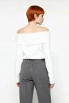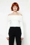 Ürün Özellikleri: Regular kalıp, polyester materyal, düz desen, carmen yaka, standart kol, triko kumaş, ekru renk.