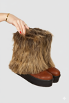 Soğuk kış günlerinde tarzınızı yansıtırken sıcacık kalmanızı sağlayan kahverengi tüylü platform bot; konforu ve şıklığı bir araya getirir; tüylü, peluş detaylı kışlık tasarımıyla dikkat çeker; dayanıklı kalın platform tabanı sayesinde kaymaz ve uzun süreli kullanım sunar; iç kısmındaki yumuşak astar ayağınızı sıcak tutar; suni deri ve yüksek kaliteli suni kürk kombinasyonu ile üretilmiştir; günlük kullanım, şehir yürüyüşleri ve soğuk hava kombinleri için idealdir; spor, bohem ve sokak modasına uygun modern bir görünüme sahiptir; tam kalıptır; etek, tayt veya skinny pantolonlarla mükemmel uyum sağlar; kış kombinlerinize sıra dışı bir dokunuş katar.