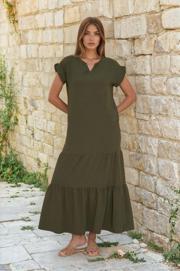 Mihrim Butik Askılı Yırtmaç Detaylı Yazlık Uzun Elbise Haki