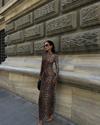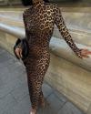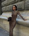 Kadın Uzun Kollu Balıkçı Yaka Gull Likralı Leopar Desen Maxi Boy Elbise