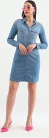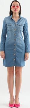 Şıklığı ve rahatlığı bir arada sunan kadın slim fit kot elbise, esnek kumaşı sayesinde vücuda mükemmel uyum sağlar.
