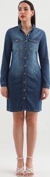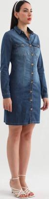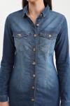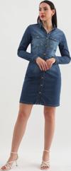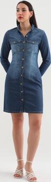 Şıklığı ve rahatlığı bir arada sunan kadın slim fit kot elbise, esnek kumaşı sayesinde vücuda mükemmel uyum sağlar.