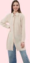 Bu bej uzun kollu gömlek, dokuma kumaşı ve rahat kalıbıyla gün boyu konfor sunar. Kemersiz tasarımı ile şık ve pratik bir görünüm sağlar. Midi boy kesimi ile modern ve stil sahibi bir tarz yaratırken, keten görünümlü dokuma kumaşı yaz aylarında serin ve rahat kalmanızı sağlar.