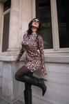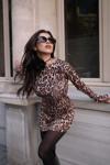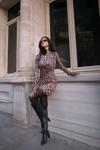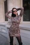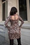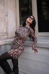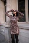 Kadın Uzun Kollu Kayık Yaka Leopar Baskılı Mini Elbise