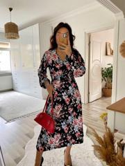 Kadın Uzun Kollu Kruvaze Yaka Beli Lastikli Yandan Yırtmaçlı Desenli Dalgıç Elbise