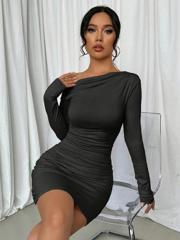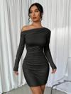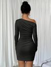 Kadın Uzun Kollu Tek Omuzu Açık Yanlardan Büzgülü Kısa Sandy Elbise