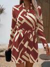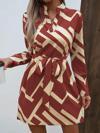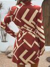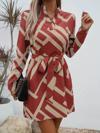 Kadın Uzun Kollu V Yakalı Desenli Belinde Kuşaklı Dalgıç Elbise