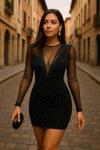 Kadın Uzun Kollu Yuvarlak Yaka Dekolteli Taşlı Dalgıç Elbise