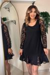 Kadın Uzun Kollu Yuvarlak Yaka Kol Ve Etek Ucu Dantelli Kısa Ithal Krep Elbise