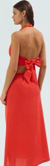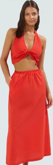 Yaz aylarının vazgeçilmez şıklığı için tasarlanan bu kırmızı uzun plaj bluz etek takımı, gün boyu rahatlık ve tarzı bir arada sunuyor. Hafif ve nefes alabilen %100 pamuk kumaşından üretilen takım, cildinizde serin bir his bırakırken, şık tasarımıyla da göz kamaştırıyor.
