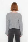 Ürün Özellikleri: Geniş kalıp, yünlü materyal, düz desen, V yaka, standart kol, triko kumaş, gri renk, baskısız tasarım.