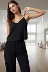 Rahatlığı ve şıklığı bir arada sunan ekru renkli pijama takımımızla tanışın! Viskon karışımlı, nefes alan kumaşıyla gün boyu konforu deneyimleyin. İnce askılı ve fırfırlı detayıyla feminen bir tarz yakalayın. Geniş paça pantolon ve regular kalıbıyla rahat hareket özgürlüğü sunar. Hem evde hem de dışarıda rahatlıkla kullanabileceğiniz bu takım, gardrobunuzun yeni favorisi olacak. Yumuşak dokusuyla cildinize nazikçe dokunan bu pijama takımı, kaliteli malzeme ve işçilikle üretilmiştir. Makinede yıkama kolaylığı sağlar. 49% Viskoz, 46% Polyester, 5% Elastan içeriğiyle uzun ömürlü kullanım sunar. Regular boy ve normal bel ölçüsüyle her vücut tipine uyum sağlar.