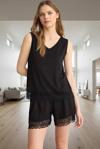 Pijama takımı, regular boyda tasarlanmış olup, 36-42 beden aralığında mevcuttur. Hem evde rahatlamak hem de uyurken kullanmak için idealdir. Takımın siyah rengi, her türlü iç çamaşırı ve gecelikle uyum sağlar. Rahatlığı ve şıklığı bir arada sunan bu takım, yaz gecelerinizi daha konforlu ve keyifli hale getirecektir.