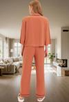 Viskon kumaşın yumuşak ve hafif dokusu, teninizde ipeksi bir his bırakacak. Truvakar kollu gömlek rahat hareket imkanı sunarken, normal bel pantolon ile mükemmel bir uyum sağlar. Regular kalıbı sayesinde her vücut tipine uygundur. Biyeli detay takımın estetiğini tamamlarken, bordo rengi şıklığınıza şıklık katacaktır. Pantolonun uzun paçaları ve rahat kesimi, gün boyu rahatlık sağlar. Bu takımla evde kendinizi rahat ve şık hissedeceksiniz.
