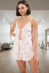 %100 pamuk kumaşın yumuşak ve nefes alabilir dokusu, cildinizde serin bir his bırakır. Regular kalıp ile tasarlanan bu pijama takımı, gün boyunca rahat hareket etmenizi sağlar. V yaka detayı, üst kısmına feminen bir dokunuş katar. Bağlama detayı ise hem şık bir görünüm sağlar hem de kişiye özel bir uyum sunar. Bu takım, yaz aylarında evinizin konforunda dinlenirken veya misafirlerinizi ağırlarken rahatlıkla kullanabileceğiniz ideal bir seçimdir. Makinede yıkanabilir özelliği ise temizliğini kolaylaştırır.