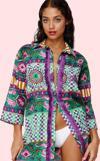 %100 pamuk vual kumaşın yumuşak dokusu, teninizde serin ve rahat bir his bırakırken, etnik desenlerin canlı renkleri stilinize enerji katıyor. Gömleğin Regular kalıbı, vücuda tam oturmadan rahat bir kullanım sağlıyor. Püskül detayları ise tasarıma hareket ve şıklık katıyor. Düğmeli kapama sistemi sayesinde kolayca giyip çıkarabilirsiniz. Yaz aylarının sıcak günlerinde serin ve şık görünmenin keyfini çıkarın.
