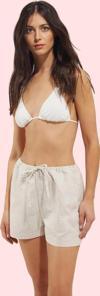 Dokulu kumaşı, dikkat çekici bir görünüm kazandırırken, ekru rengi her türlü üst giyimle kolayca kombinlenebilir. Şortun kısa boyu, bacaklarınızı sergilemenizi sağlarken, rahat kesimi gün boyu hareket özgürlüğü sunar. Deniz kenarında, havuz başında veya şehrin karmaşasında, bu şort size şıklık ve rahatlık sağlayacaktır. Özellikle sıcak yaz günlerinde serin kalmanız için ideal bir seçenektir. Makinede 35 derecede yıkanabilir olması da pratik kullanım sağlar.