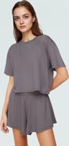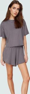 Yaz aylarının sıcak günlerinde serin ve rahat kalmanızı sağlayacak bu şık gri t-shirt ve şort takımını keşfedin! Yumuşak dokusuyla teninizde yokmuş gibi hissedeceğiniz, nefes alabilen örme kumaştan üretilmiştir. Günlük kullanım için mükemmel olan bu takım, rahatlığı ve şıklığı bir arada sunuyor. Düşük kol detaylı t-shirt ve geniş paçalı şort ile rahatlığı en üst düzeye çıkarırken, düz deseni ve gri rengi ile her ortama uyum sağlar.
