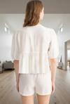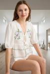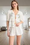 Yaz aylarının sıcak gecelerinde kendinizi serin ve rahat hissetmenizi sağlayacak, şık ve modern bir pijama takımıyla tanışın! %100 viskon kumaştan üretilen bu nefes alan pijama takımı, yumuşak dokusuyla teninize mükemmel bir uyum sağlayacak. Beyaz renginin sadeliği, üzerindeki zarif çiçek nakışlarıyla birleşerek, size şık ve feminen bir görünüm kazandıracak. Fiyonk detaylı üst kısmı, hem şık bir görünüm katarken, hem de kolayca giyip çıkartabilmenizi sağlayacak. Regular kalıbıyla her vücut tipine uyum sağlayan bu pijama takımı, evde rahatça vakit geçirmeniz için ideal. Kısa kollu üst ve şort alt ile yaz geceleri için mükemmel bir tercih. Makinede kolayca yıkanabilir özelliği sayesinde pratik bir kullanım sunuyor. Bu yaz, kendinizi özel hissetmek için ideal bir seçim.