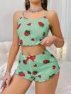 Kadın Yeşil Çilek desenli şortlu gecelik pijama takımı, cesur ve şık bir görünüm yaratır. Yumuşak kumaşı sayesinde rahat kullanım imkanı sunar.