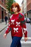 Bu göz alıcı kadın kazağı, yılbaşı ruhunu şıklıkla birleştiren eşsiz tasarımıyla hemen dikkat çeker. Regular kalıbı sayesinde farklı vücut tiplerine mükemmel uyum sağlayarak rahat bir giyim deneyimi sunar. %100 akrilik materyalden üretilen bu kazak, cildinize yumuşak dokunuşlar yaparak gün boyu sıcacık kalmanızı sağlar ve soğuk kış günlerinde vazgeçilmeziniz olur. Canlı kırmızı rengi ile bayram coşkusunu yansıtan bu özel parça, zarif fiyonk desenleri ve ışıltılı inci detaylarıyla tatil sezonunun en trend parçalarından biri olmaya adaydır. Neşeli ve modern bir görünüm sunarak kış gardırobunuza enerji katmayı hedefler.