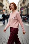 Ürün Özellikleri: Regular kalıp, 80% akrilik 20% polyester materyal, nakışlı/işlemeli desen, bisiklet yaka, düşük kol, triko kumaş, pembe renk, crop boy.