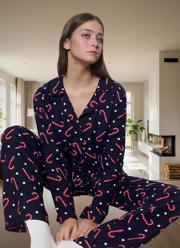 Bu yılbaşını evinizin rahatlığında şık bir şekilde karşılamak ister misiniz? O zaman lacivert puantiyeli ve şeker kamışı desenli bu pijama takımı tam size göre! Yumuşak viskoz dokusuyla gün boyu konfor sunarken, şık tasarımıyla da evinizde tarzınızı yansıtmanıza olanak tanır. Geniş paçası ve rahat kalıbıyla hareket özgürlüğü sağlar. Şık ve rahat bir ev ortamı için ideal olan bu takım, soğuk kış günlerinde sıcacık hissetmenizi sağlayacak. Yüksek kaliteli viskoz kumaşı nefes alabilir ve yumuşacıktır. Düğmeli tasarımıyla kolayca giyip çıkarabilirsiniz. Bu özel tasarım pijama takımını giyerken kendinizi rahat ve şımartılmış hissedeceksiniz. Bu yılbaşı gecesi için mükemmel bir tercih olup, sevdiklerinize de harika bir hediye olabilir. Makinede yıkanabilir olması ise kullanımı oldukça pratik hale getiriyor. Rahat ve şık bir uyku deneyimi için hemen sipariş verin!