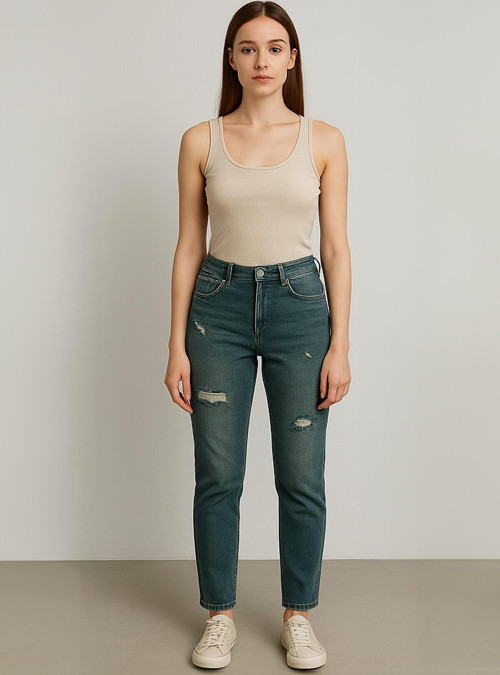 Kaliteli denim kumaştan üretilmiştir. Likralı esnek rahat bir yapısı vardır. Yüksek beldir. Yırtık detayları bulunmaktadır. Ürün boy uzunluğu 102 cm dir. Paça genişliği 18 cm dir.