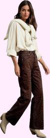 Bu model, 36-44 beden aralığında mevcuttur. Uzun boyu ile her boyda kadına uyum sağlar. Özellikle boyu uzun olan kadınlar için ideal bir seçimdir. Pantolonun modern ve şık tasarımı, çeşitli üstlerle kolayca kombinlenebilir. Baskın renk kahverengi olup, leopar deseni ile mükemmel bir uyum yakalamıştır. Makinede yıkanabilir olmasının yanı sıra, düşük ısıda kurutulabilir ve ütülenebilir.