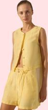 Sıcak yaz günlerinde hem şık hem de rahat olmak mı istiyorsunuz? O zaman bu sarı keten mini şort tam size göre! Yüksek bel tasarımı ve geniş paçası ile son derece rahat ve şık bir görünüm sunuyor. %100 keten kumaşından üretilen şort, nefes alabilir özelliği sayesinde gün boyu ferahlık sağlar. Rigid dokuma tipi ise şortun formunu ve kalitesini uzun süre korumasını garanti eder. Beli bağlama detayı, şorta şık bir dokunuş katarken, kısa boyu da hareket özgürlüğünüzü kısıtlamaz.