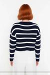 Ürün Özellikleri: Oversize kalıp, akrilik materyal, çizgili desen, bisiklet yaka, düşük kol, triko kumaş, bej renk.