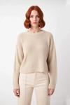 Ürün Özellikleri: Oversize kalıp, akrilik materyal, çizgili desen, bisiklet yaka, düşük kol, triko kumaş, bej renk.