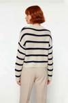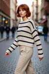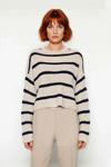 Ürün Özellikleri: Oversize kalıp, akrilik materyal, çizgili desen, bisiklet yaka, düşük kol, triko kumaş, bej renk.