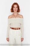 Ürün Özellikleri: Fitted kalıp, akrilik materyal, düz desen, carmen yaka, standart kol, triko kumaş, ekru renk, baskısız tasarım, crop boy.