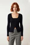Özgün kare yaka tasarımı, boyun ve dekolte bölgenizi zarifçe çerçevelerken, ön kısmındaki dekoratif düğme detayları tasarıma hareket katar. Uzun ve standart kol yapısı, rahat hareket imkanı sunarken, tek plaka triko kumaşı nefes alabilirliği ile gün boyu ferahlık ve konfor sağlar. Bu kaliteli materyal, uzun süreli kullanıma uygun dayanıklılık gösterir ve formunu korur. Bakım kolaylığı sunan akrilik yapısı sayesinde, yoğun yaşam temposunda pratik bir tercih olur.