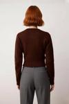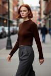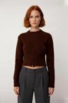 Ürün Özellikleri: Regular kalıp, akrilik polyester materyal, düz desen, bisiklet yaka, düşük kol, triko kumaş, kahverengi renk, korse fermuar detaylı, crop boy.