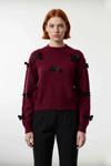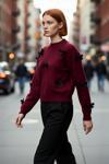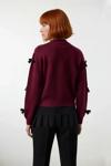 Ürün Özellikleri: Regular kalıp, akrilik ve polyester materyal, kurdele fiyonklu desen, bisiklet yaka, standart kol, triko kumaş, bordo renk, baskısız tasarım.