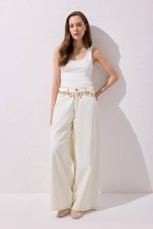 Dökümlü bol kot pantolon koyu ekru, ince dokulu pamuk denim kumaşı ile gün boyu rahatlık sunar. Yüksek bel tasarımı, vücut hatlarını zarif bir şekilde vurgularken, bol paça kesimi modern ve özgün bir tarz yaratır. Esnek arka bel lastiği ve kullanışlı cepleriyle hem konfor hem de işlevsellik sağlar. Sade bir stil için basic gömlek ve düz ayakkabılarla kombinleyebilir, şık bir görünüm için zarif bluzlar ve topuklu ayakkabılarla tamamlayabilirsiniz. Her ortamda hem rahat hem de çabasız şık görünmek isteyenler için ideal bir tercih!
