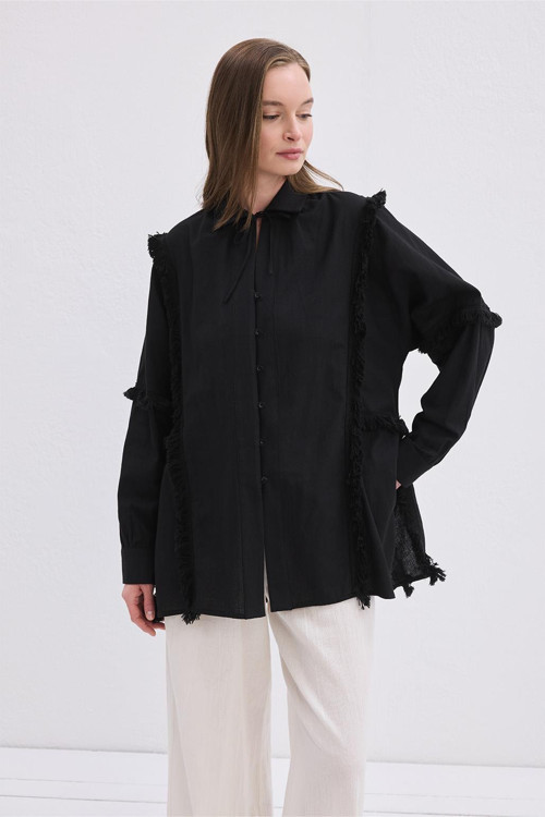 Doria Püsküllü Keten Gömlek Siyah, viskon karışımlı keten kumaşıyla hafif, nefes alan ve doğal bir şıklık sunar. Klasik yakası ve brit düğme kapaması sade bir görünüm kazandırırken, yandan yırtmaç ve püskül detaylarıyla bohem bir ifade taşır. Uyumlu renk aksesuarıyla tamamlanan tasarımı, hem günlük stilinizde rahatlıkla kullanabileceğiniz hem de yaz akşamlarında özgün kombinler yaratabileceğiniz çok yönlü bir duruş sunar. Zamansız yapısı ve özgün dokunuşlarıyla, gardırobunuzda fark yaratan bir parçaya dönüşür.