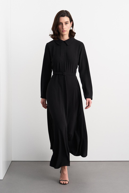 Kemerli çan uzun elbise siyah, cupra karışımlı ipek hissiyatlı kumaşıyla zarafeti ve rahatlığı bir arada sunar. Belden aşağı çan formuyla boyu uzun gösterirken, kemerli ya da kemersiz kullanımıyla farklı tarzlara kolayca uyum sağlar. Hem gündüz hem de gece kombinlerinize uyum sağlayacak şekilde tasarlanmıştır. Zamansız tasarımı sayesinde mevsim geçişlerinde de ideal bir seçimdir.