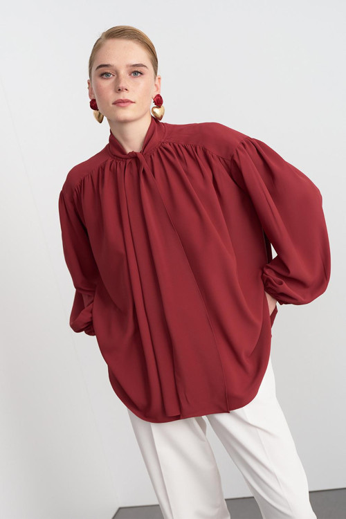 Melsa büzgülü fularlı gömlek bordo, ipek hissiyatlı kumaşı ve şık detaylarıyla zamansız bir stil sunar. Büzgü ve fular tasarımı, sade kombinlere zarif bir dokunuş katarken, ceketlerle klasik bir görünüm, pantolonlarla modern bir tarz yaratmanızı sağlar. Günlük hayatınızdan özel günlerinize kadar çok yönlü kombin imkanı vaad ederek stilinizi bir üst seviyeye taşır