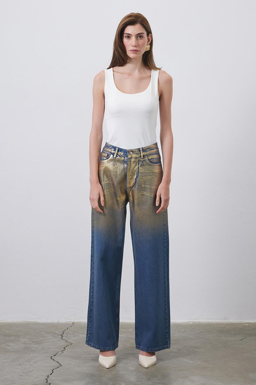 Parlak baskı desenli palazzo denim pantolon gold ,rahat kesimi kalıp formu sayesinde konforu en yüksek hissettiren ,tüm kombinlerinizin en sevilen kurtarıcısı olacaktır.