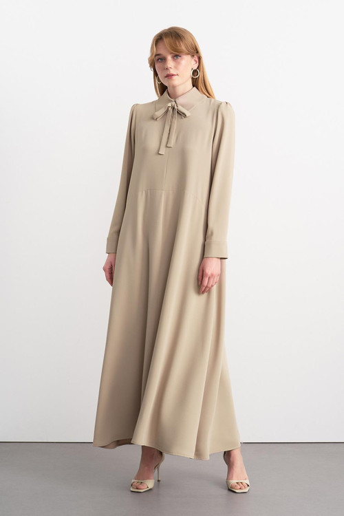 Yaka bağlamalı uzun elbise taş, cupra karışımlı, ipek hissiyatlı kumaşıyla zarafeti ve konforu bir araya getiriyor. Açılır kapanır tasarımı, hem spor hem de şık kombinlere kolayca uyum sağlar. Yaka bağlama detayı modern bir dokunuş katarken, dökümlü kesimi sayesinde bedene yapışmaz ve rahat bir hareket alanı sunar. Günlük kullanımda spor ayakkabılar ile sade bir şıklık yakalayabilir, topuklu ayakkabılar ve minimal aksesuarlarla özel davetlerde zamansız bir stil yaratabilirsiniz. Her dolapta mutlaka bulunması gereken, modası geçmeyen bir parça olarak bu sezon vazgeçilmeziniz olacak!