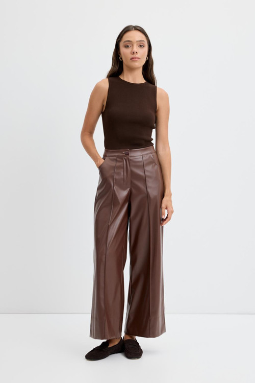Yüksek Bel Nervur Dikişli Deri Pantolon Kahve, suni deri kumaşıyla modern ve güçlü bir görünüm sunar. Yüksek bel kesimi vücudu toparlarken, önden geçen cima dikişleri tasarıma yapı kazandırır. Fermuar kapaması ve cepli formu günlük kullanımda pratiklik sağlar. İddialı ama sade stiller için dolabınıza farklılık katacak tamamlayıcı bir modeldir.