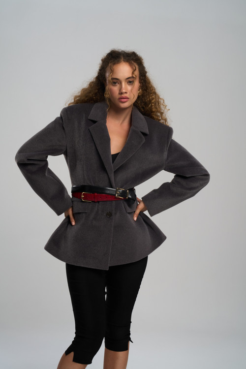 Bele oturan formda, ön kapaması 2 düğmeli, cepli, uzun kollu kaşe blazer ceket.
