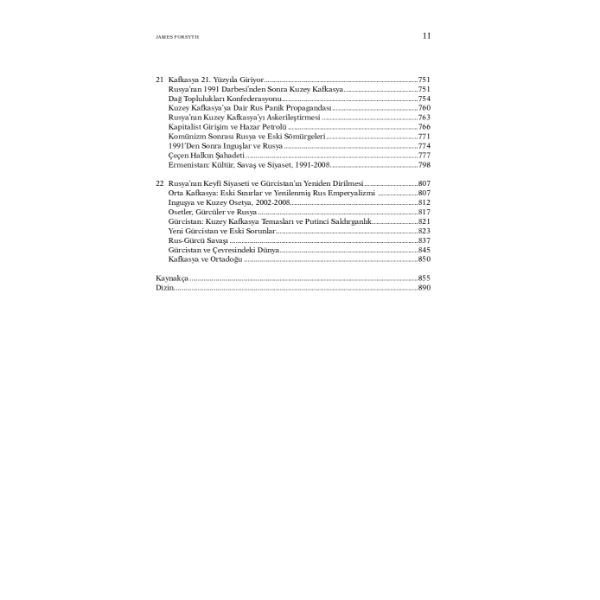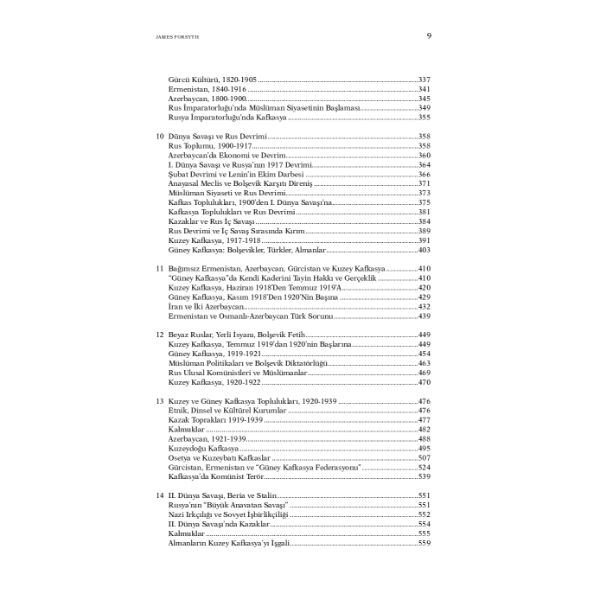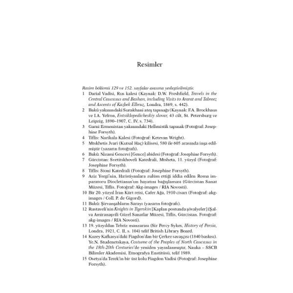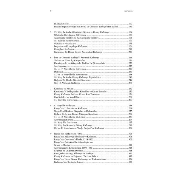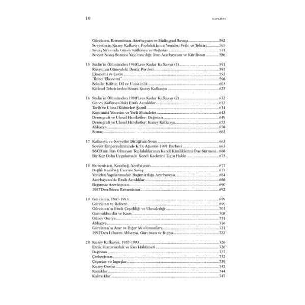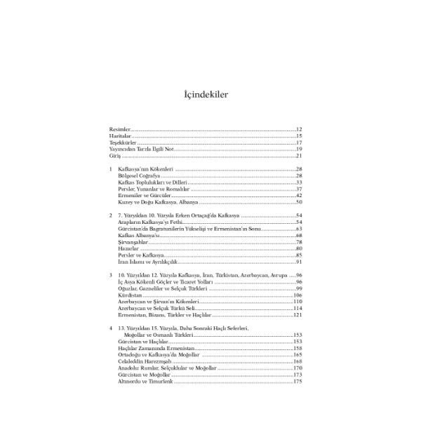 Elinizdeki bu kitap Kafkasya'yı enine boyuna inceleyen büyüleyici bir çalışma. Avrupa, Asya ve Ortadoğu'nun sınırlarında yer alan bu karmaşık bölgenin tarih öncesinden bugününe ışık tutan, Kafkasya'nın tarihini bir bütün halinde sunan kitap, modern tarihçiliğin emsalsiz örnelderinden biri. Kafkasya binlerce yıl boyunca birbirleriyle kesişen göç, istila, ticaret ve kültür yollarının bir merkezi; Avrupa ile Asya arasında tekrar tekrar karşılaşılan, istilalara açık bir köprü olmuştur. Hem İngilizce ve Rusça kaynaklara hem de Farsça ve Arapça çevirilere dayanan bu yetkin çalışma, bölgenin Ermeniler, Azeriler., Çeçenler, Dağıstanlılar, Çerkezler ve Gürcüler de dahil olmak üzere yerli toplulukları ve onların, bölge yaşamında bugün hala rol oynayan bölge dışından topluluklarla ilişkileri üzerinde yoğunlaşmakta. Kitap bunun yanı sıra, Kafkas ülkerinde Rus emperyalizminin rolüne ve yerli topluluklarının büyük bir kısmının nazik dengelere dayanan bağımsızlık girişimleri uğruna umutsuz mücadelelerine eleştirel bir bakış açısı da sağlamaktadır.
