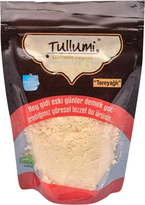 Tullumi Sürmene Peyniri, Kahvaltı Dünyası markası olmakla birlikte firma mühendislerinin unutulan yöresel tatların hatırlanması aynı zamanda da yeni nesillerin hoşuna gidebileceği yeni bir lezzet yaratma arzusu ve yıllarca süren AR-GE çalışmaları sonucunda ortaya çıkmıştır. Tullumi Sürmene Peyniri, özellikle Karadeniz bölgesinde üretilen 4-5 farklı yöresel peynir çeşidi ile doğal Trabzon Yayık Tereyağının özel bir teknikle harmanlanması sonucu elde edilmektedir. İçeriğinde yüksek oranda Trabzon Yayık Tereyağı içermesi sebebiyle, paketi açıldıktan sonra kendi zipli ambalajında veya hava almayacak vakumlu kaplarda muhafaza edilmesi ve kısa süre içerisinde tüketilmesi önerilir. Ürünün yüksek yağ içeriğinden dolayı açıkta kalması halinde tadında ve kokusunda kısa sürede değişimler gözlemlenebilir. Ürünümüz hammadde olarak doğu Karadeniz coğrafyasının tamamından etkilendiği için zengin bir aromatik lezzete sahiptir. Yöremizin mevsimsel zenginliğinden ve hayvanların mevsimden mevsime değişen beslenme alışkanlıklarından da etkilenen Sürmene Tullumi Peyniri kendi özgü yapısıyla fark yaratmaktadır. Tullumi Sürmene Peyniri, başta tarifine paketinizin arkasındaki QR kodu okutarak da ulaşabileceğiniz Tullumi’li Yumurta olmak üzere, kahvaltı sofralarınızda, böreklerde, salatalarda, poğaçalarda, makarnalarda kullanabileceğiniz gibi meşhur Sürmene Pidesi hazırlarken de fark yaratacaktır. Tullumi Sürmene Peyniri, 0-4 derece aralığında buzdolabınızda muhafaza edilmelidir. Ürün hassasiyeti göz önünde bulundurularak müşterilerimize tüm ürünlerimizde de olduğu gibi yeni üretilmiş ürünler gönderilmektedir. Tullumi Sürmene Peyniri vakumlu ambalajlarda, soğuk zincir taşımacılığa uygun