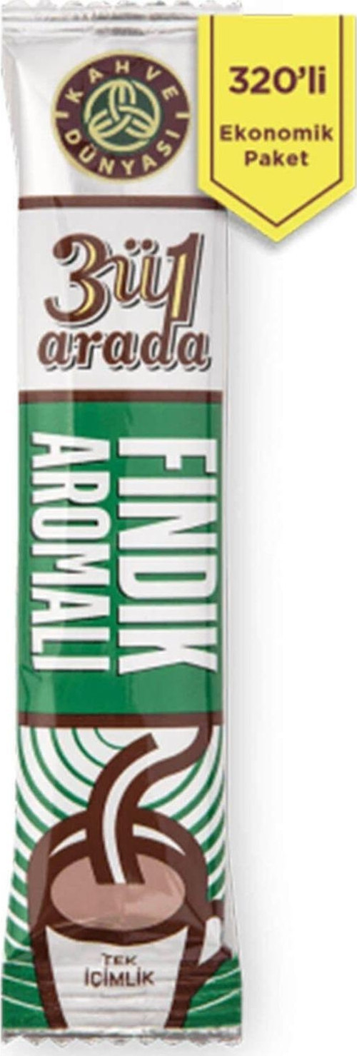 Kahve kreması ve şekerle karıştırılmış halde sunulan kahve dünyası 3'ü 1 arada, lezzetli bir fincan kahve için en pratik ve hızlı çözümdür.Kahve, krema, şeker ve fındık aroması... Fındık aromalı 18 gram 3’ü 1 arada, uzun soluklu kahve keyfiniz için 18g tek içimlik 320'li kutu ambalajlarında.