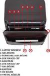 Çanta içerisinde, 15.6 inç laptop bölmesi, fermuarlı ara bölme, ana bölme, çok amaçlı cepler, kalemlikler ve kartlıklar yer alır. Geniş iç yapısı sayesinde hem iş seyahatlerinde hem de günlük kullanımlarınızda ihtiyaç duyduğunuz tüm eşyalarınızı düzenli bir şekilde taşıyabilirsiniz.